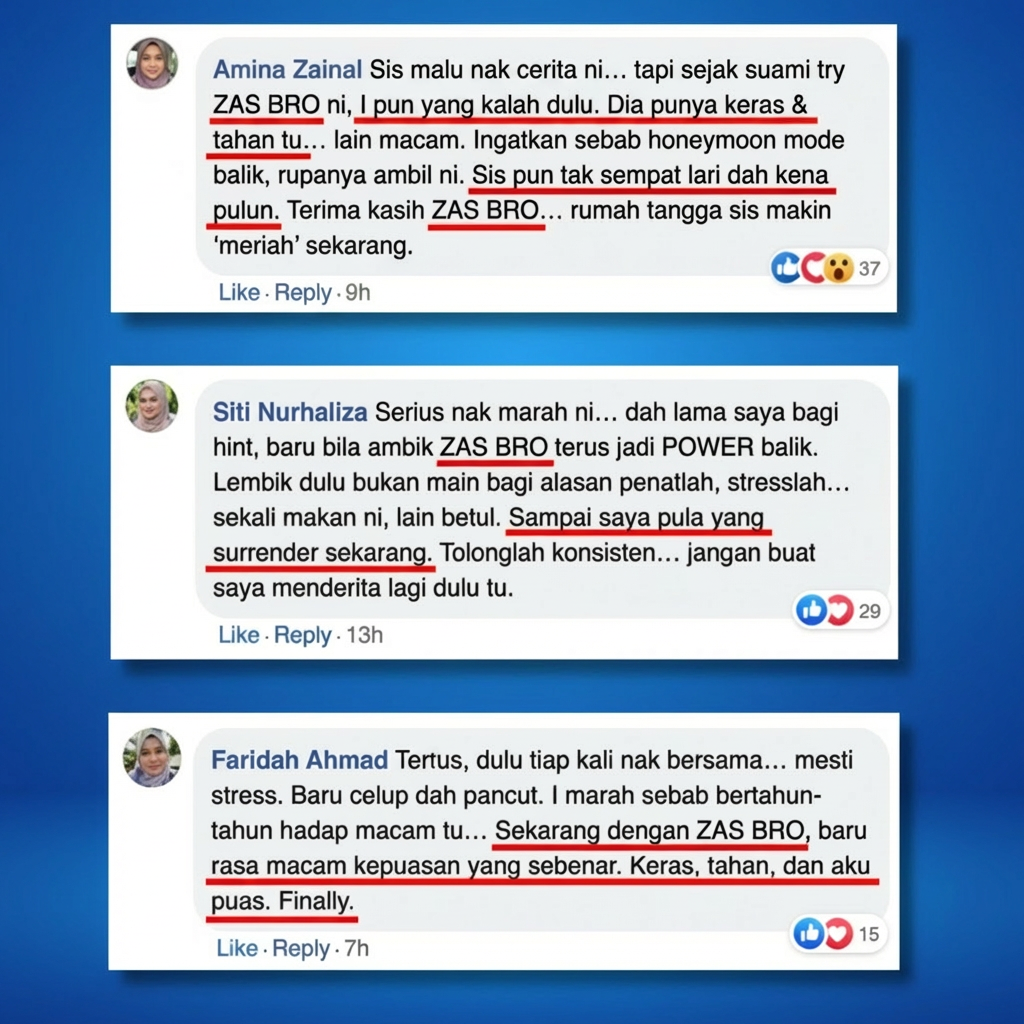 "Sebelum ni Encik Kamal ada masalah kencing manis hadapi 3 tahun masalah susah naik dan susah nak kembang lama, tapi lepas ikhtiar Zas Bro ni memang memuncak nafsu, awang
